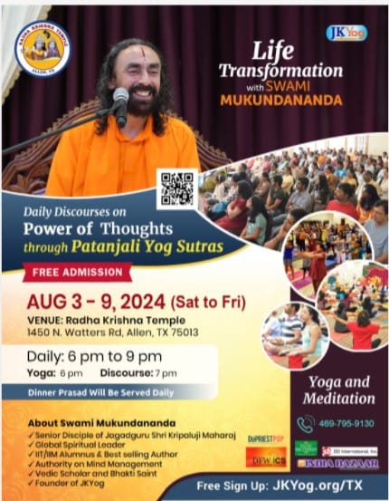 To learn more about how to utilize the power of thoughts to control the mind based on Maharshi Patanjali’s Yog Sutras, we invite you to participate in JKYog’s Life Transformation Program in Dallas to immerse yourself in spiritual upliftment with fellow devotees. Join us for the most enlightening discourses by Swamiji for an entire week. Register for the program now!