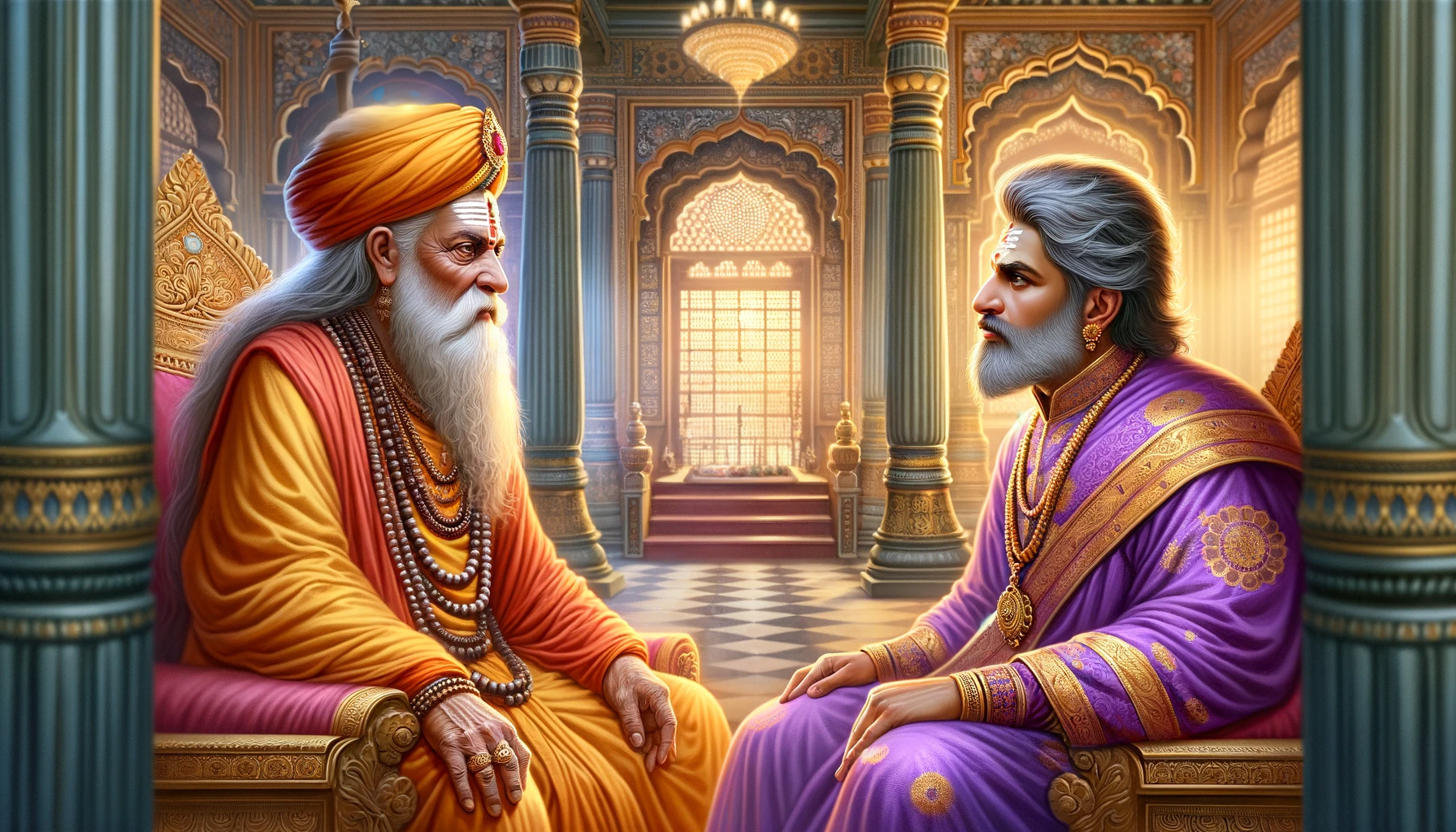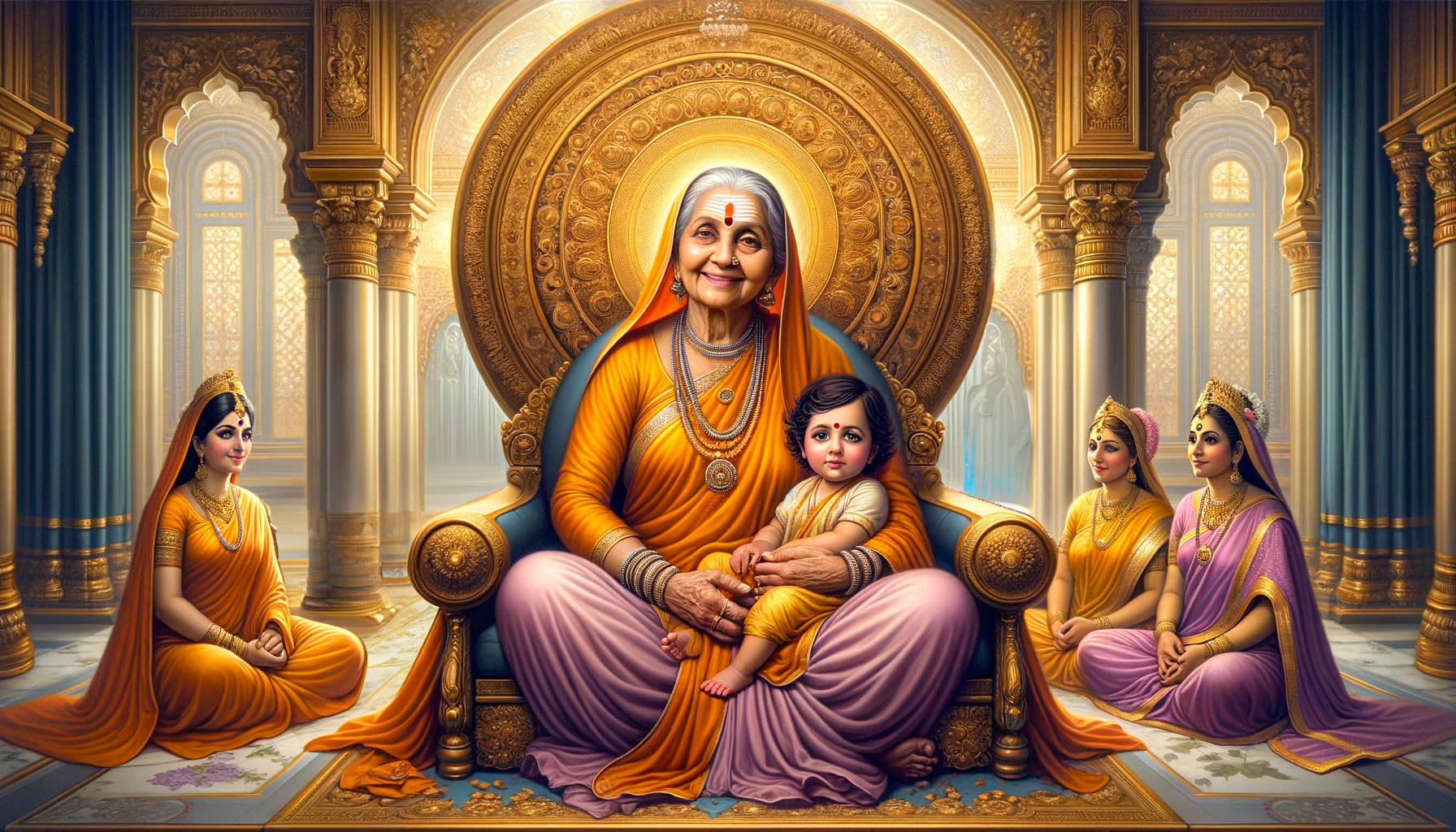 Arundhati went to the Palace into the Queens’ Chambers with her grandchild. The queens sat around Guruma with reverence. When Dashrath returned from his courtroom, he saw that guruma was there. He too bowed down to offer respect.