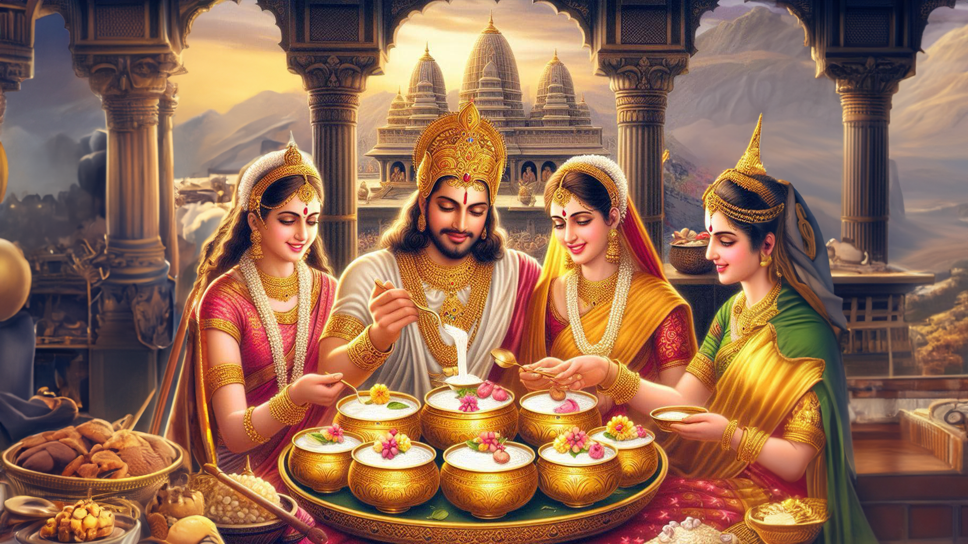From what remained he took half and gave it to Kaikeyi. Dashrath took the remaining and he divided it again between Kaushalya and Kaikeyi and asked both to offer it to Sumitra. Sumitra felt immensely gratified for receiving two portions, “I am indebted to both of you. If I have children, I give my word that they will serve your children.”