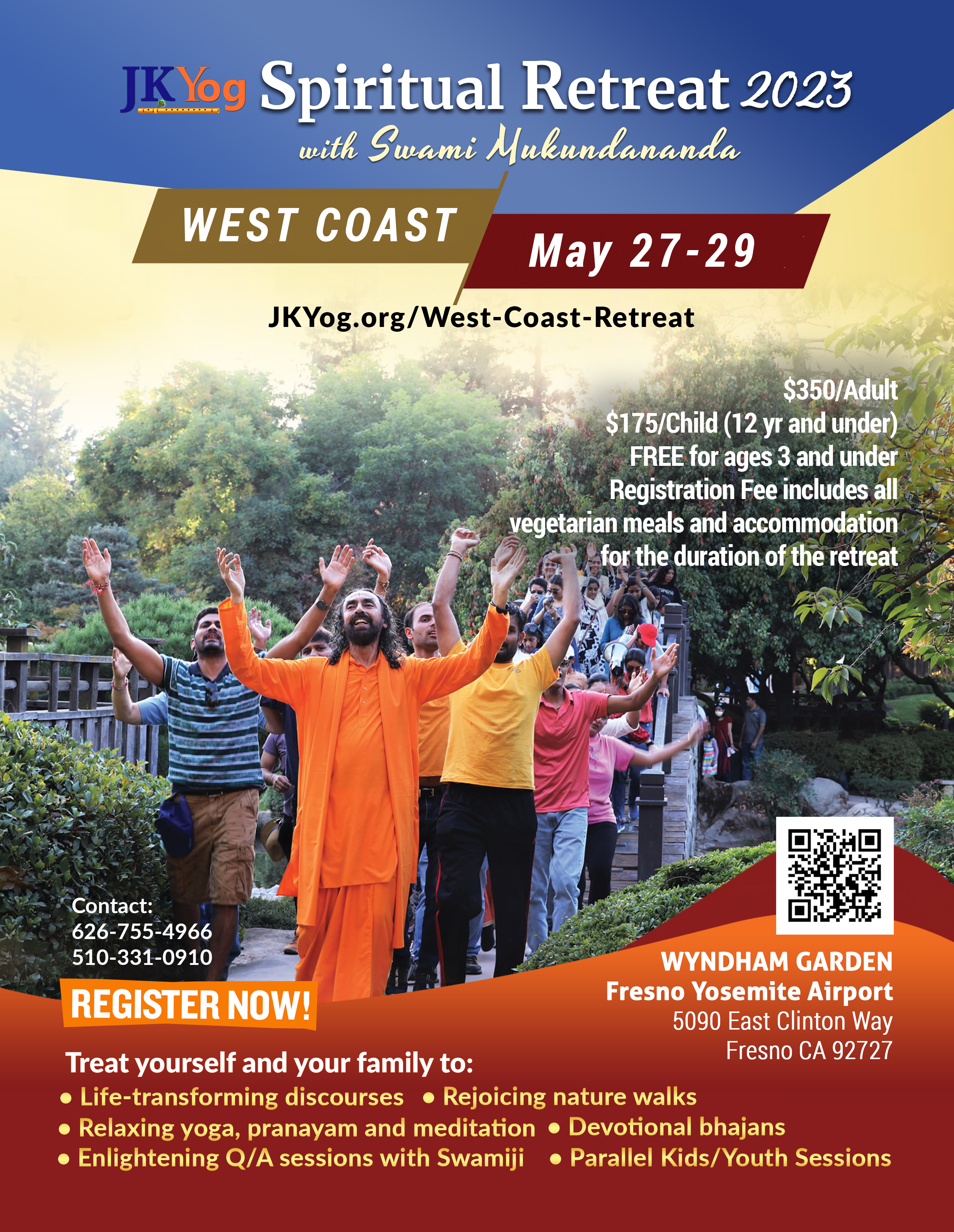 All retreats with Swamiji provide the most blissful of experiences, from divine lectures to fun-filled outdoor parikramas to yogasans, meditation, and soulful kirtans. This year, the West Coast Retreat will cover enlightening discourses on the Bhagavad Gita. As always, there will be parallel sessions for Bal-Mukund children and youth club activities. Here are the details: