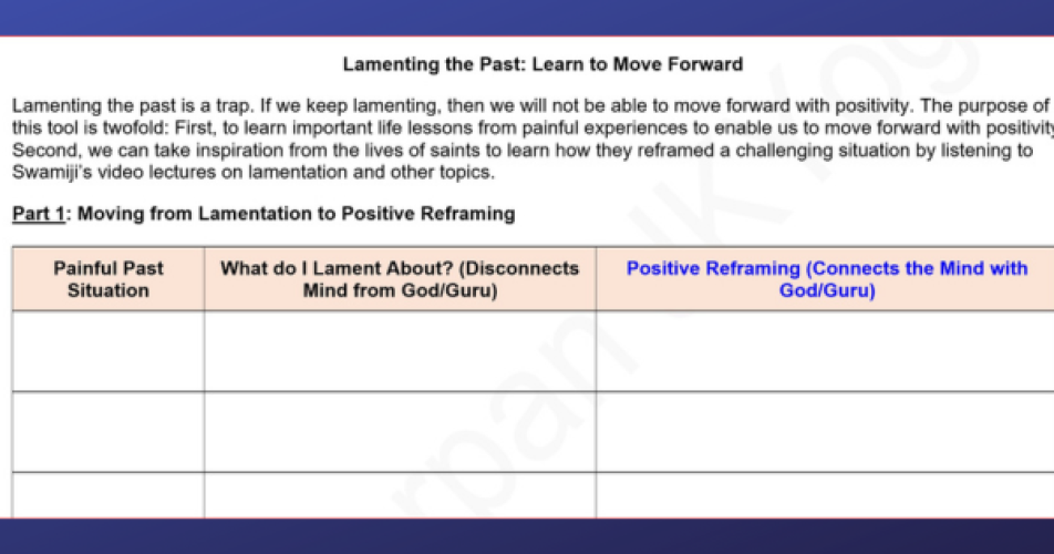 First, to learn important life lessons from painful experiences to enable us to move forward with positivity. Second, we can take inspiration from the lives of saints to learn how they reframed a challenging situation by listening to Swamiji’s video lectures on lamentation and other topics.