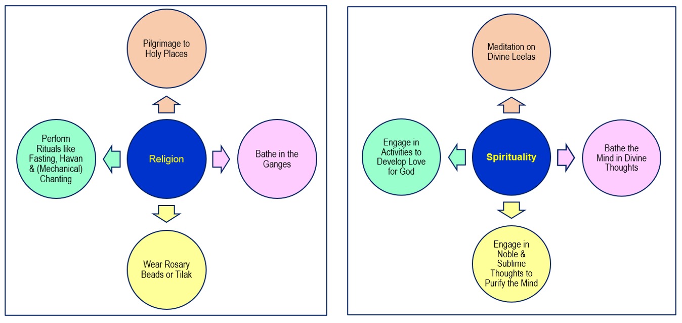 While religiosity conforms to the prescribed norms as stated in the scriptures and practiced in society, spirituality conforms to recommended practices to purify the mind, cultivate ethical values, and understand and apply divine knowledge in order to develop love for God. Religiosity may please those who value external forms of worship, but spirituality pleases God/Guru because the goal is internal transformation, resulting in the elevation of the soul. While the goal of every religion in the world is to develop love for God, it has been observed that when rituals per se become the goal, devotion may be compromised in favor of the rituals that may not elevate the soul.