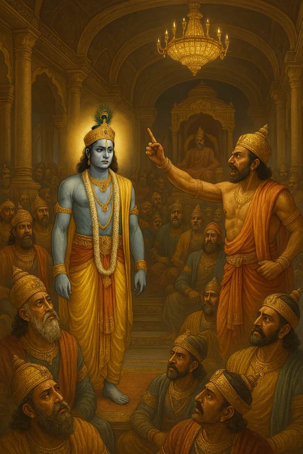 Alarmed and heartbroken, Shishupal’s mother pleaded with Shree Krishna to spare her son’s life. Moved by her maternal devotion, Shree Krishna made a solemn vow: He would forgive Shishupal for one hundred offenses. Only when that limit was crossed would He act.