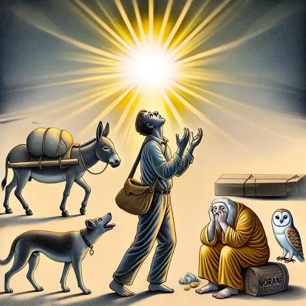 Swami Ji humorously explains human discontent through this story. God gave man 30 years, but man asked for more. So, God added donkey years (burden of work), dog years (guarding possessions), and owl years (living in darkness). The story reveals that the restless human mind is never satisfied, proving why surrender is so difficult without practice.