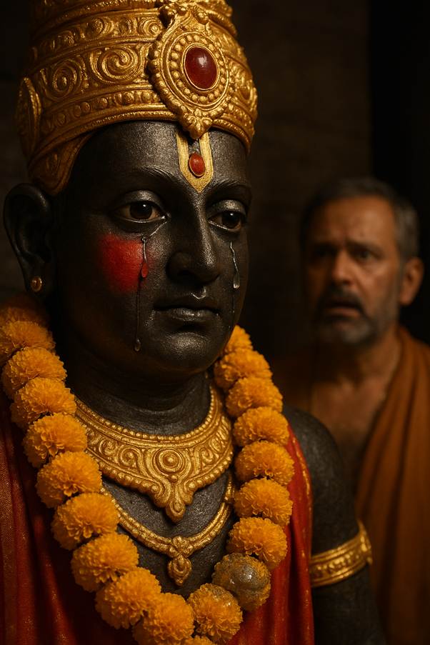 Every evening, Bhagavan Vitthal would leave His temple to visit Chokhamela. One day, Chokhamela’s wife, Saira, accidentally spilled yogurt while offering bhog to the Lord. Chokhamela scolded her, “You have stained the Lord.” Just then, the temple priest happened to pass by and overheard the exchange. Misinterpreting Chokhamela's words as a deliberate display of devotion, the priest's anger flared, and he slapped Chokhamela. But when the priest stepped inside the sanctum... his eyes widened. The cheek of the deity of Bhagavan Vitthal was red and tears flowed down His eyes. The truth hit the priest like thunder: Chokhamela is not outside the temple. He lives in God's very heart.
