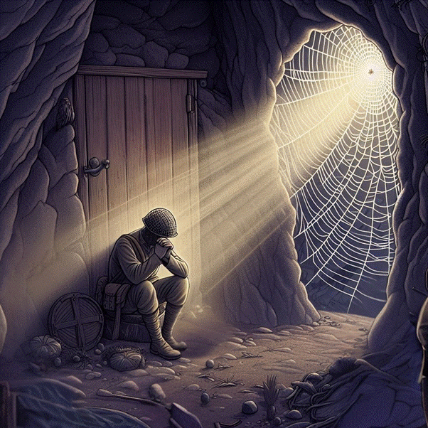 Not long after, the enemy soldiers reached the cave. Hidden within, the soldier held his breath as they stood just outside. “Should we check inside?” one asked. Another scoffed, “Impossible. Look at that spider web. No one could have gone in without tearing it.”