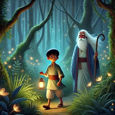 Once, a little boy found himself lost in a dense forest at night. Frightened by the sounds of wild animals and blinded by the darkness, he stumbled aimlessly, unsure of where to go. Suddenly, an old sage appeared with a lit lantern. The boy rushed to him and asked, “Baba, can you please help me find my way home?”
