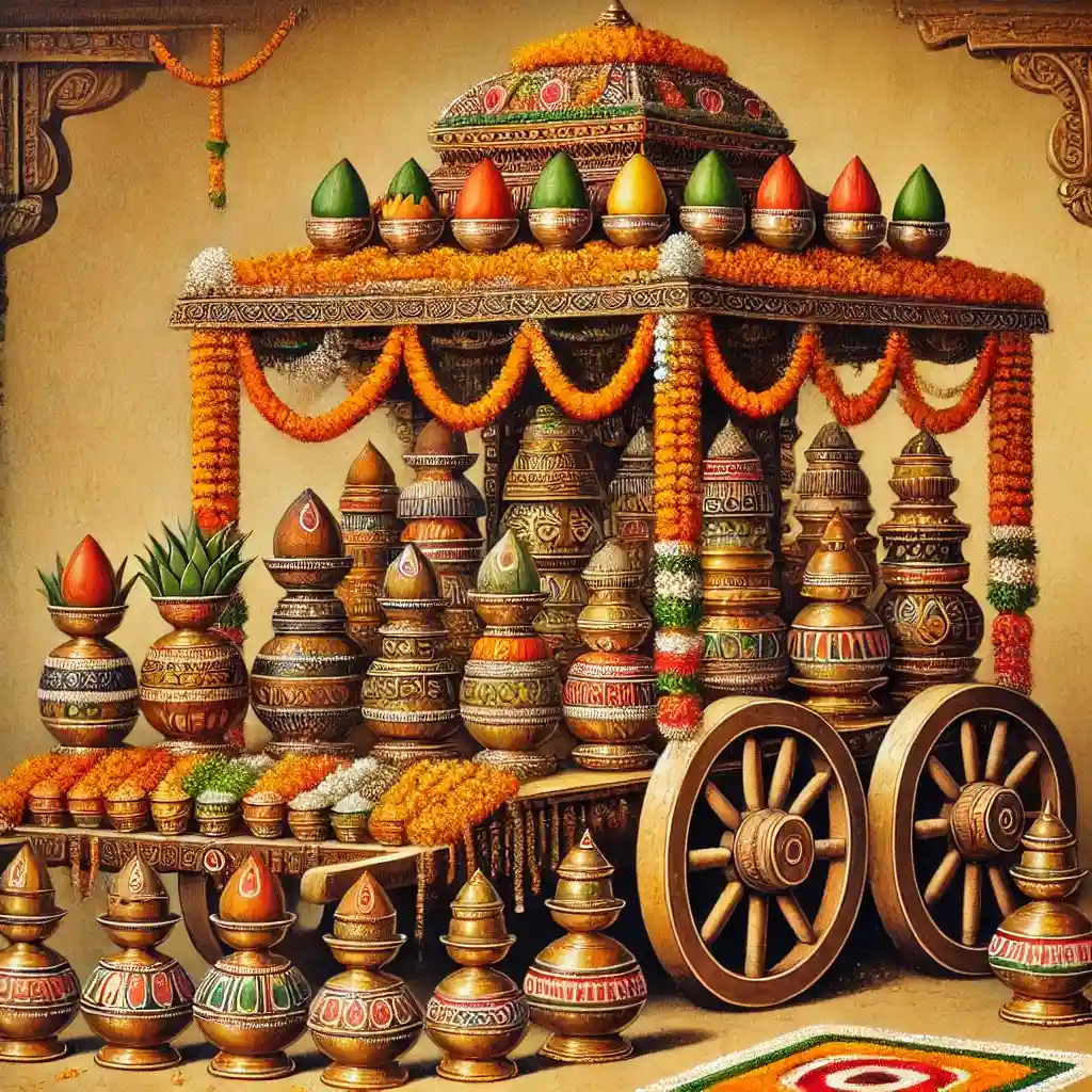 Unknown to the villagers, the demon Shakatasura, sent by Kansa, had concealed himself inside the cart, waiting for the right moment to attack. As the ritual continued and the people became absorbed in their duties, Shree Krishna lay quietly beneath the cart. Then, with a gentle motion of his tiny foot, he gave the cart a simple kick. Instantly, the entire structure collapsed, the pots scattered, and Shakatasura was destroyed on the spot.