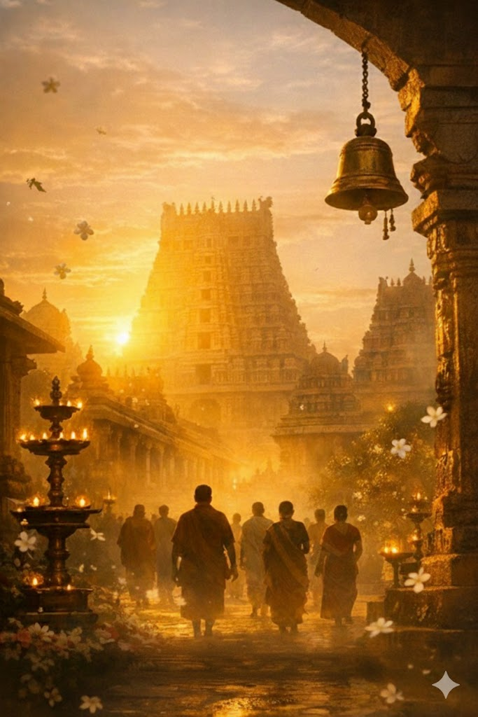 Imagine walking through the golden gates of Srirangam, as dawn pauses in reverence. The city glows—not with sunlight alone, but with something softer, deeper, alive. Jasmine and Tulasi perfume the air, carried gently by the breath of the Kaveri. Sandalwood smoke curls upward, as if even the wind has learned how to pray.
