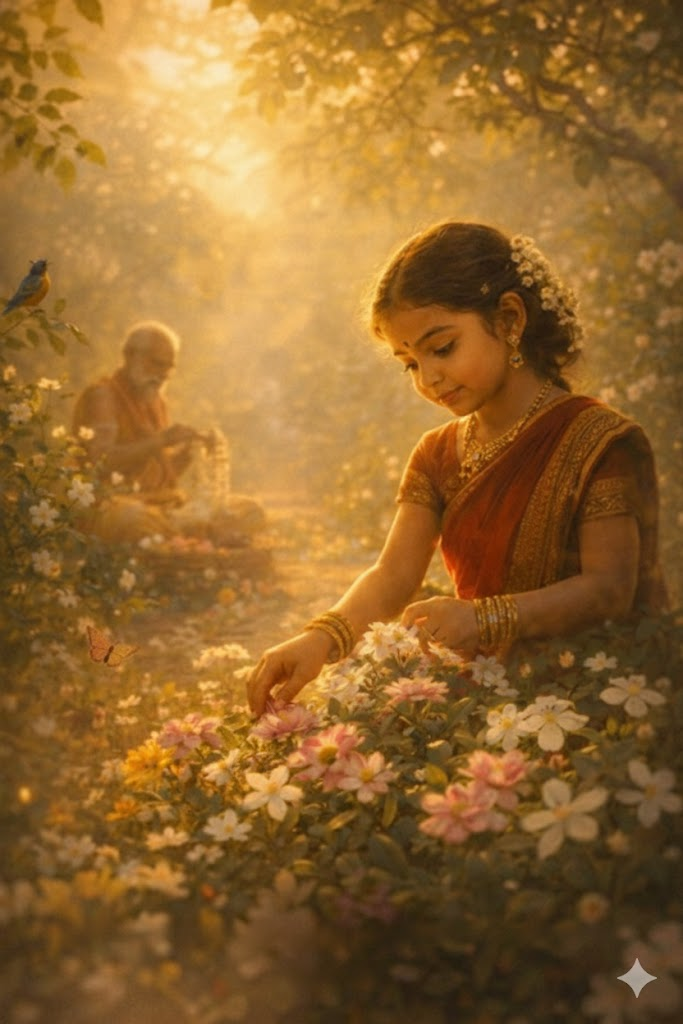She followed her father into the garden, observing closely as he gathered flowers and wove garlands with reverence. To her, the flowers were gestures of love—soft carriers of emotion. She observed how petals were chosen, how threads held them together, how devotion took form through touch.