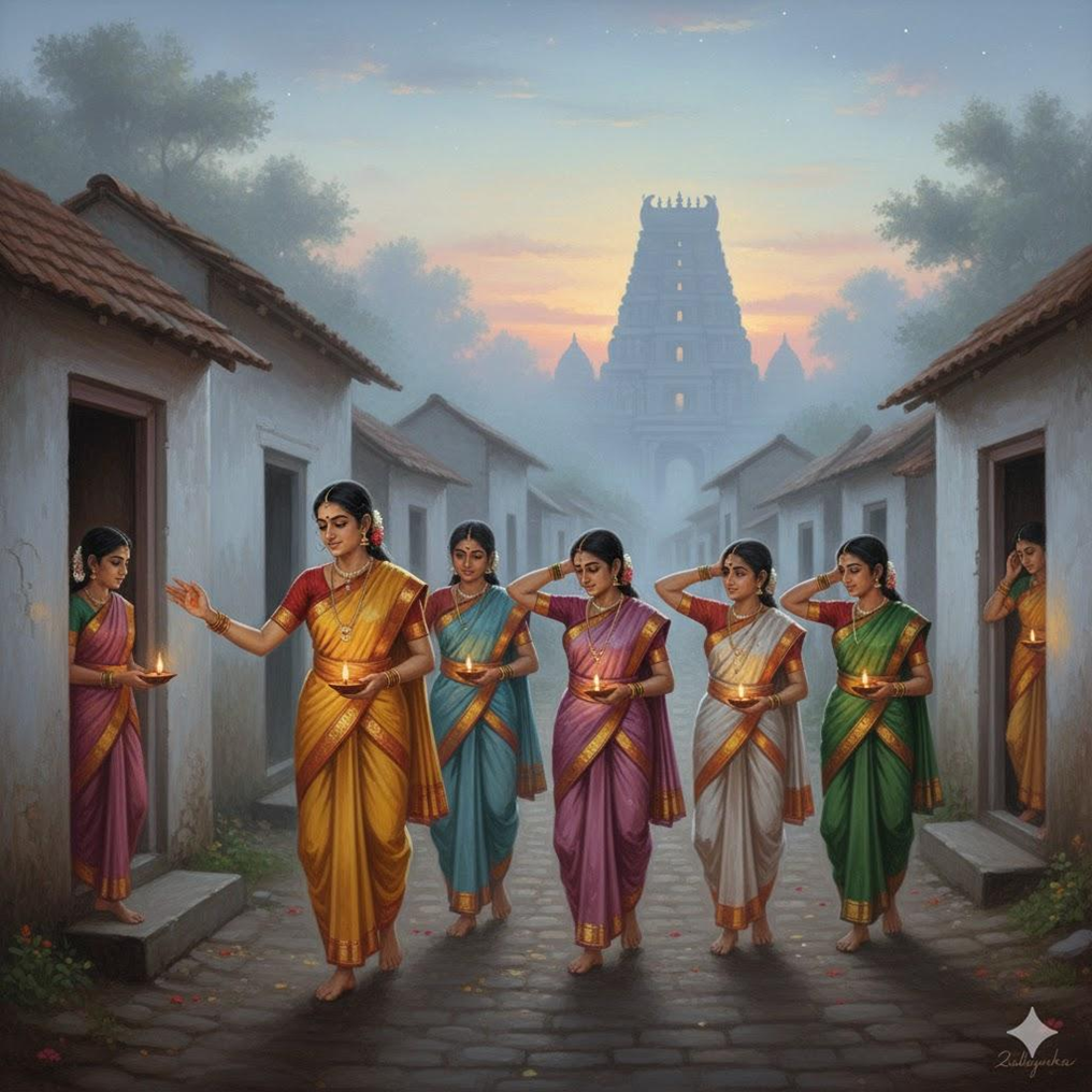 The Tiruppavai is recited during Margazhi (Dhanurmasam). Each verse is an offering of love, devotion, and longing for the Divine, guiding devotees toward spiritual awakening and union.