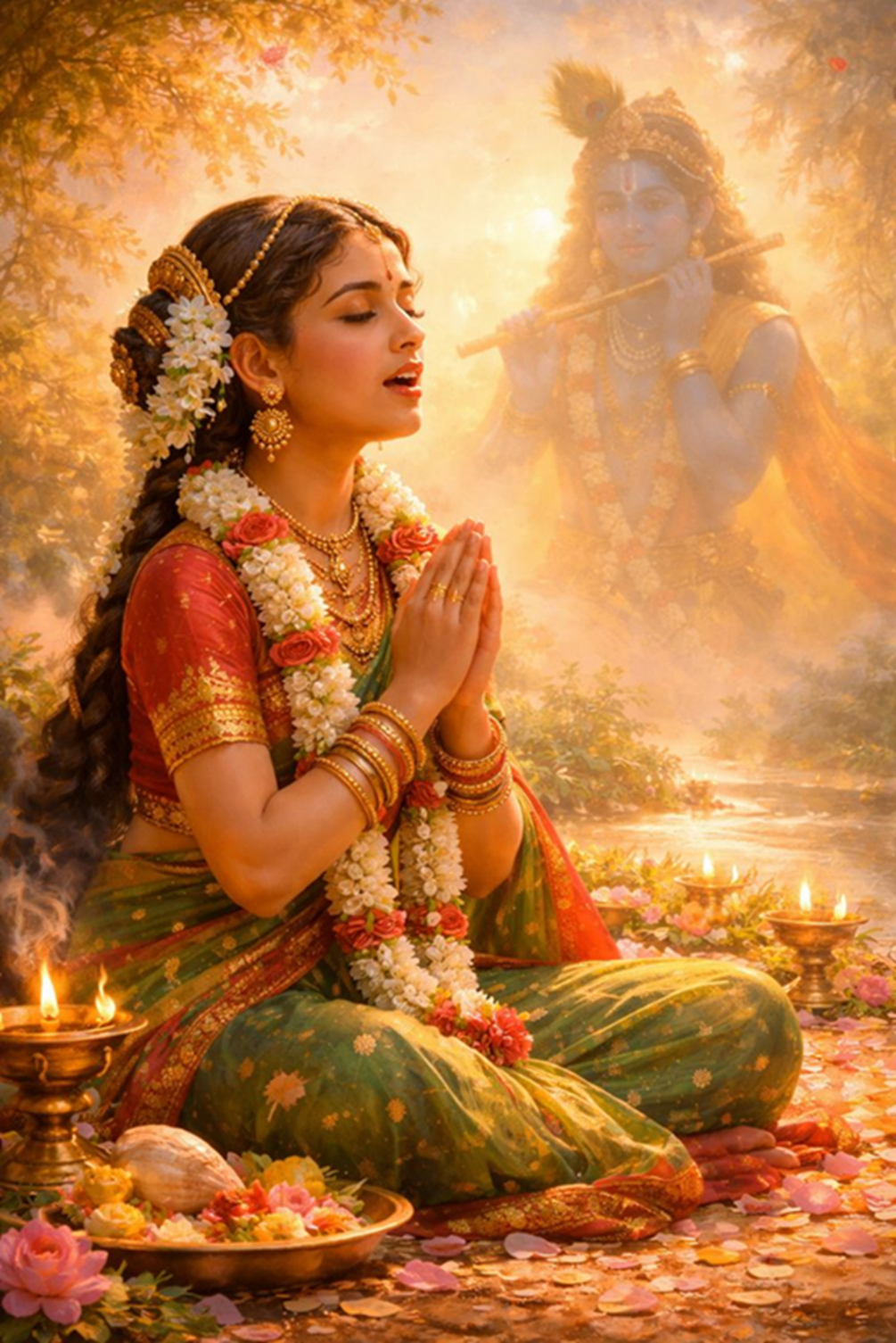 During the sacred month of Dhanurmasam, Goda embraced the ancient Katyayani Vrat, inspired by the gopis of Vrindavan. She walked the same inward path of surrender to attain Krishna as her eternal Beloved.