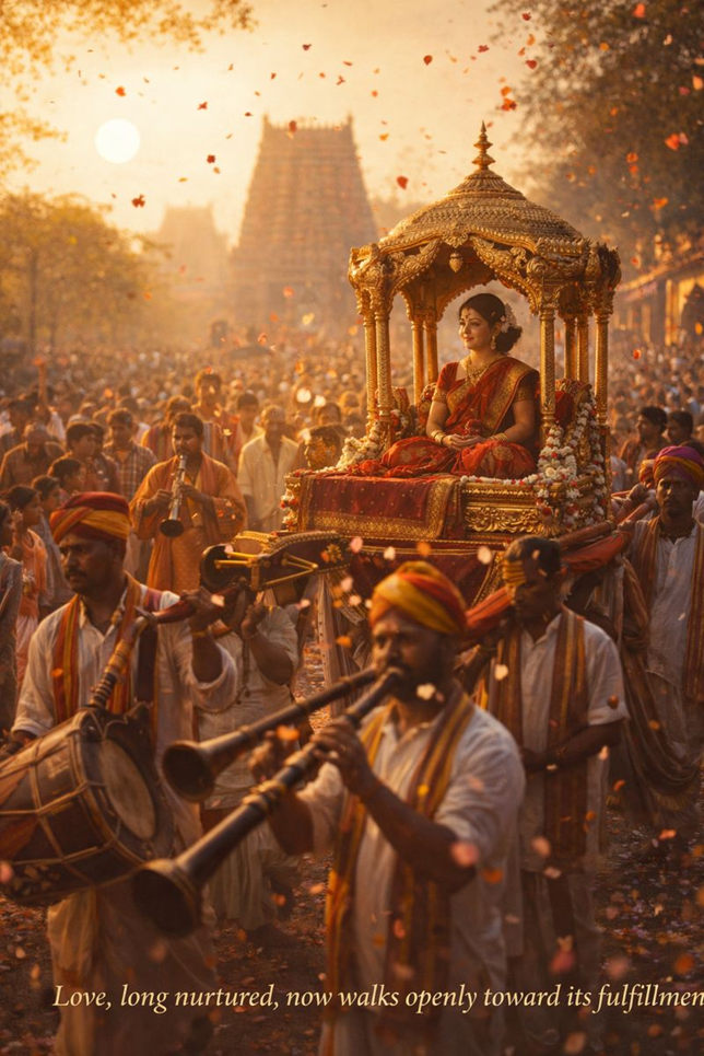 With each step toward Srirangam, Andal’s love leads her closer to the Lord, her longing transforming into divine embrace.