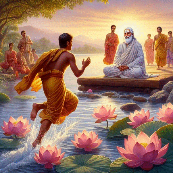 Sanandana, washing the Guru’s clothes on the far bank of the river, heard his name and rushed back. Such was the depth of his devotion that, lotus flowers bloomed beneath his feet, carrying him across the river. When he reached the Guru, Sanskrit verses of praise spontaneously poured from his mouth, astounding all. Since then, he came to be known as Padmapada—the one whose feet birthed lotuses and he became one of the major disciples of Adi Shankaracharya. The lesson is clear: even an ordinary intellect, when offered in complete surrender, becomes a channel for divine grace.