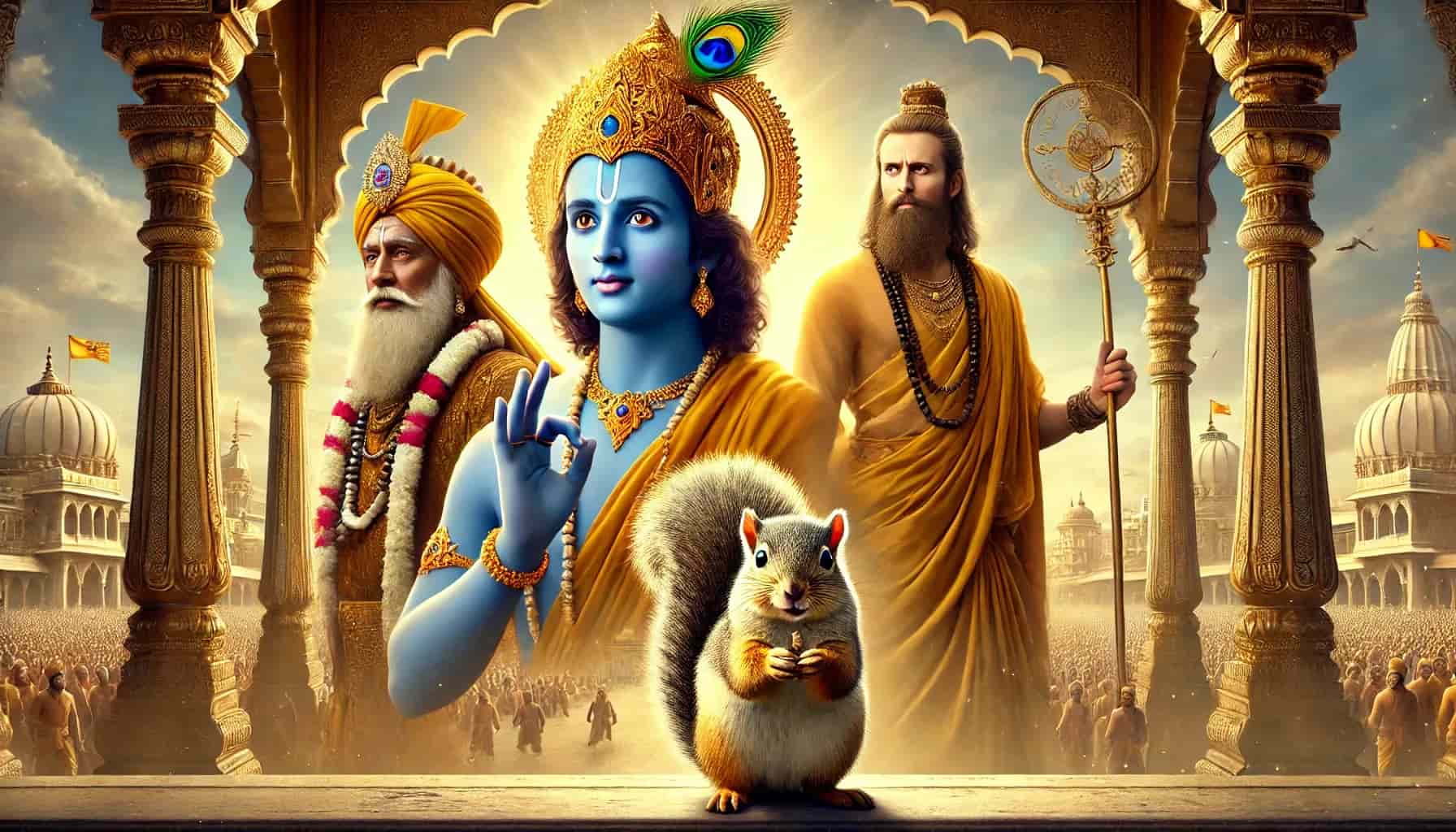 During Yudhishthir Maharaj’s grand Rajasuya Yagya in Indraprasth, a curious incident took place. The Pandavas, along with Lord Krishna, witnessed a squirrel enter the yagya mandap. Half of the squirrel’s body was golden, and it repeatedly attempted to roll onto its other side.