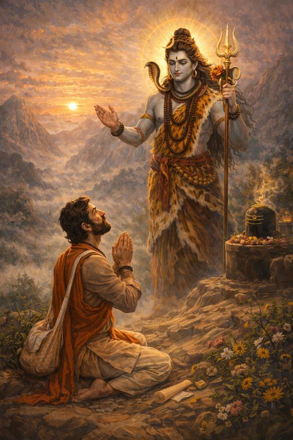 Hours passed, and the temple soon bustled with worshippers. All were astonished to see the two neighbors utterly absorbed in chanting Lord Shiv’s name. Mistaking them for great saints, devotees bowed in reverence and laid flowers at their feet. By evening, Maa Parvati observed their relentless chanting and said to Lord Shiv, “Maharaj, these two have been taking Your name incessantly since morning. Please give them darshan.”