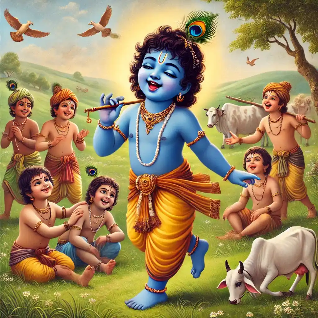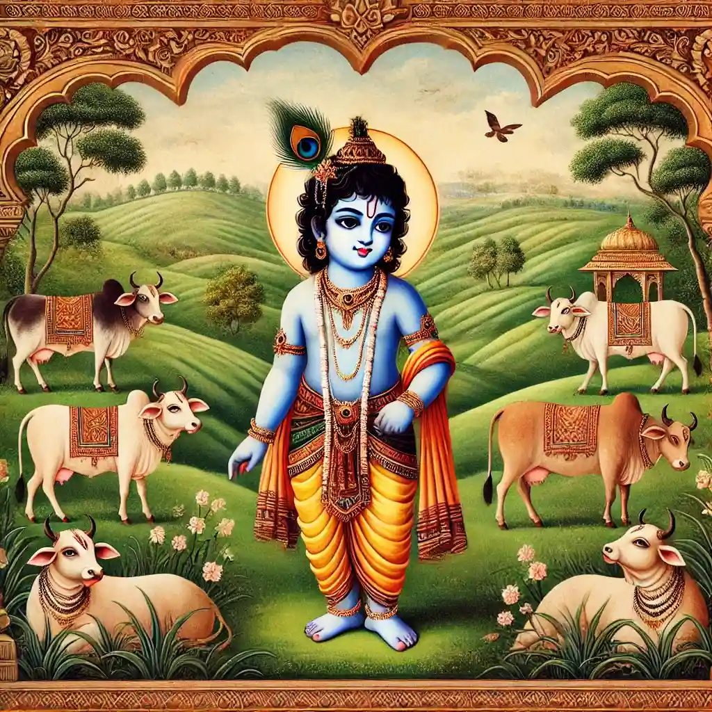 A major event in Shree Krishna’s early life was Gopasthami, a festival celebrating the moment when a young cowherd is deemed ready to take the cows into the forest for grazing. For Shree Krishna, this happened at the tender age of five. On that day, he officially began his duty as a cowherd, joining the elder boys in caring for the herd.