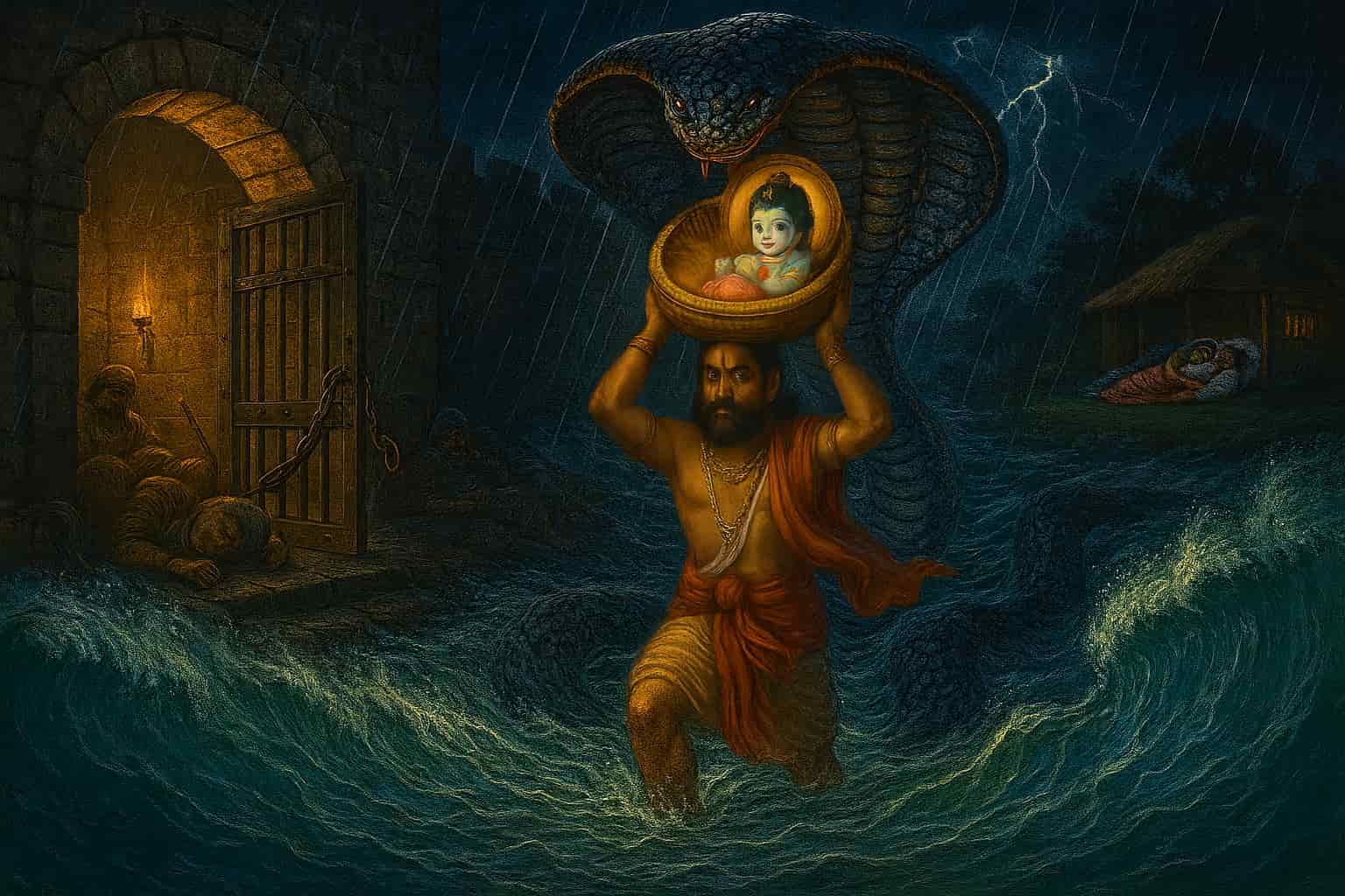 Following divine instructions, Vasudeva placed baby Krishna in a small basket and prepared to carry him across the violently flowing Yamuna river to Gokul. As he stepped into the raging waters, the river miraculously parted, creating a path. Above him, the divine serpent Shesha spread his hoods, shielding the infant from heavy rainfall.