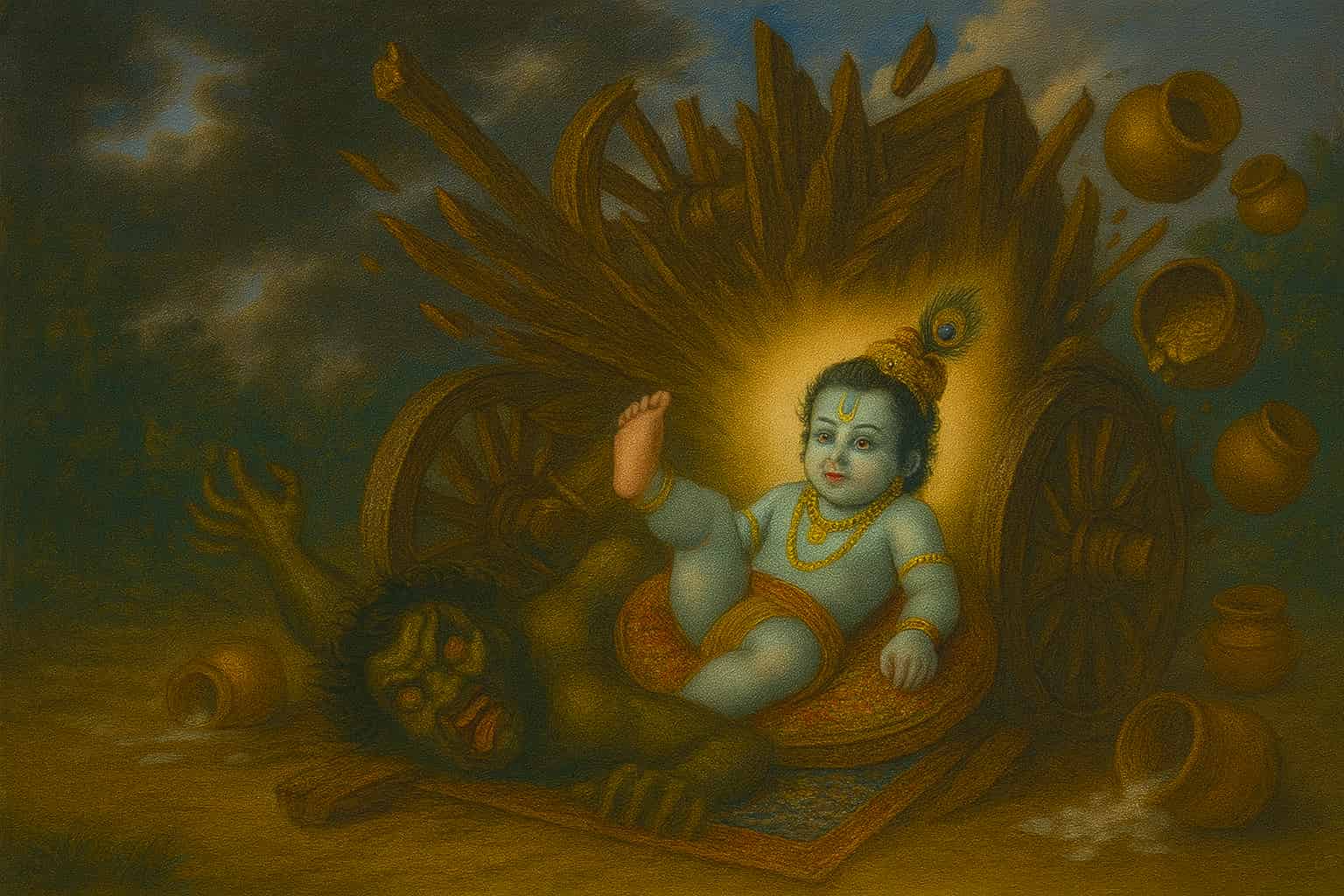 On Krishna's first birthday, while celebrations were underway, Shakatasura disguised himself as a wooden cart under which baby Krishna was placed for a nap. The demon intended to crush the infant under its weight when the moment was right. Remarkably, the tiny Krishna simply lifted His lotus foot and kicked the cart, shattering it completely. Wheels flew in opposite directions, pots crashed, and wood splintered everywhere as the demon was instantly destroyed.