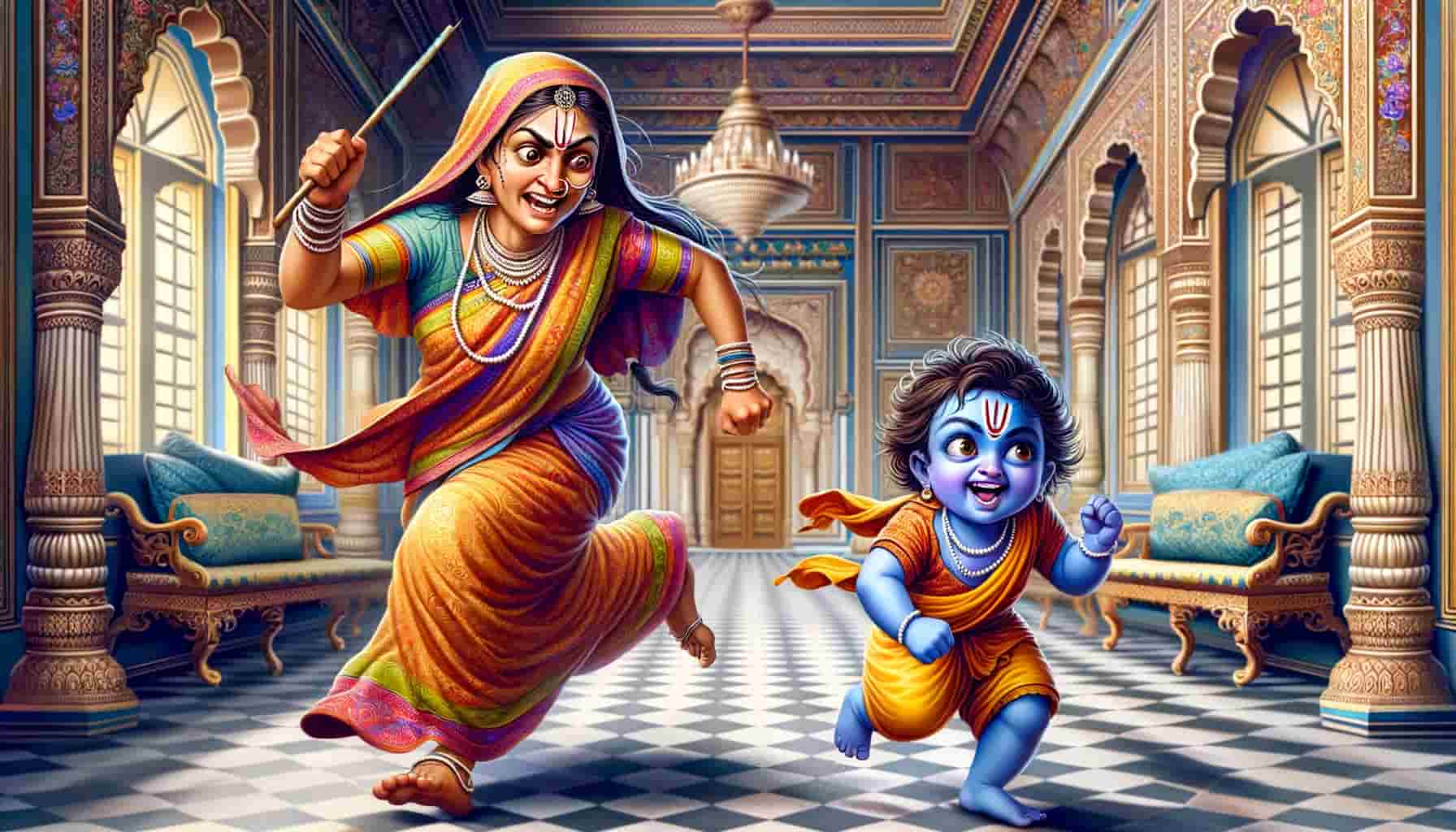 Upon visiting Vrindavan, sage Narad witnessed an extraordinary scene—the Supreme Lord running fearfully from His mother. Utterly perplexed, Narad observed how Krishna, who governs infinite universes, submitted completely to Yashoda's authority. Through this observation, Narad grasped that maternal love transcends even devotional awe, as it allows the Divine to experience being cherished unconditionally.