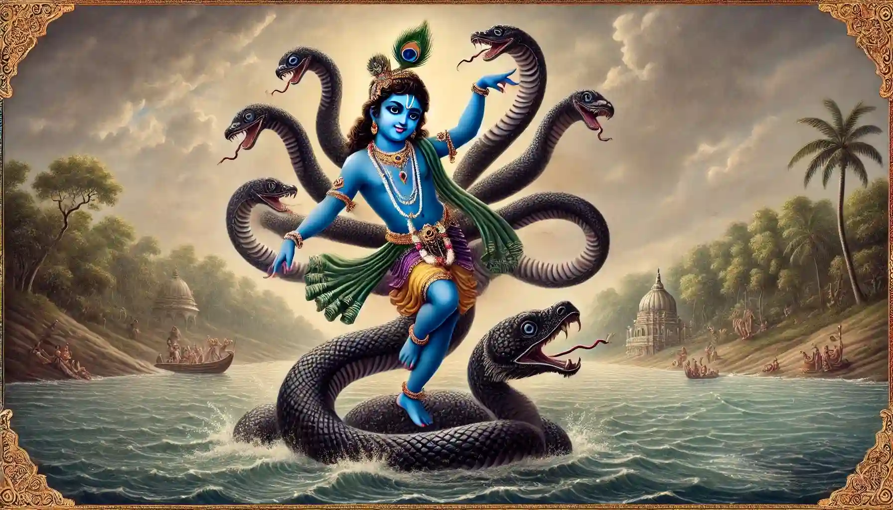 Krishna subdued the venomous serpent Kaliya by dancing on its multiple hoods, purifying the Yamuna river and restoring life and balance to the environment.