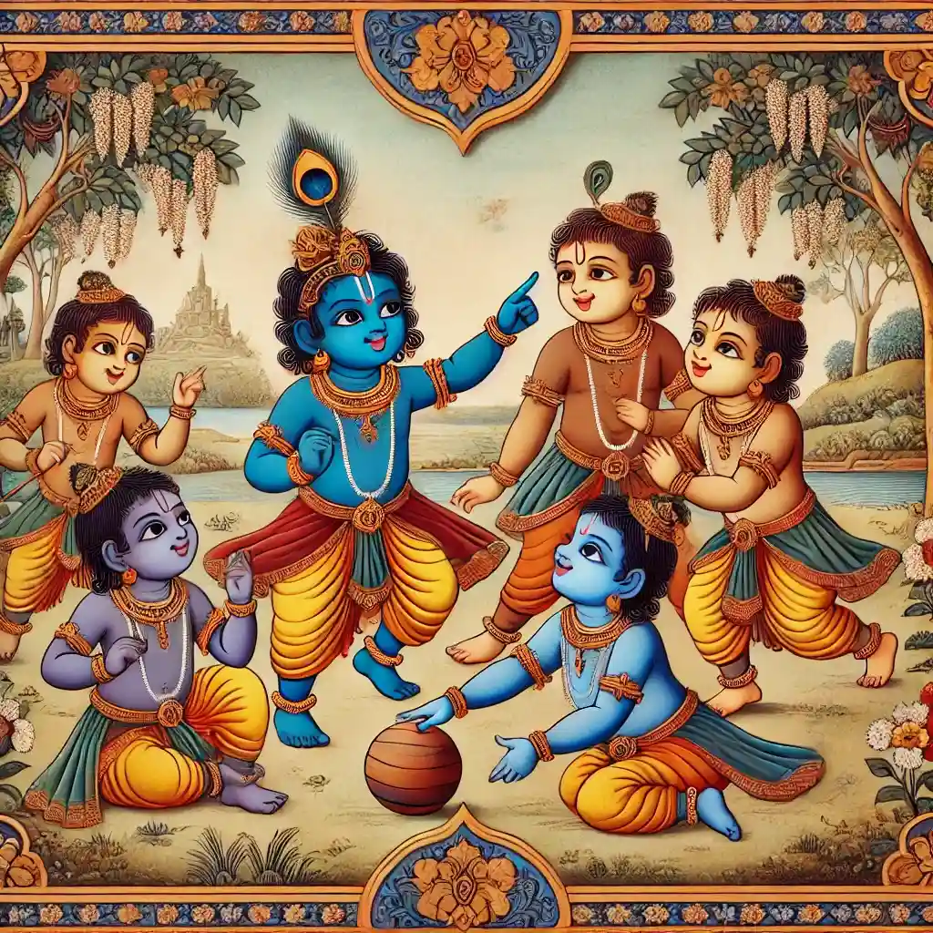 One sunny day in Braj, Shree Krishna and his childhood friends were playing a game of ball on the lush riverbanks of the Yamuna. The boys had one simple rule: anyone who accidentally threw the ball into the river had to retrieve it himself. The game was lively, filled with laughter and joyful energy.