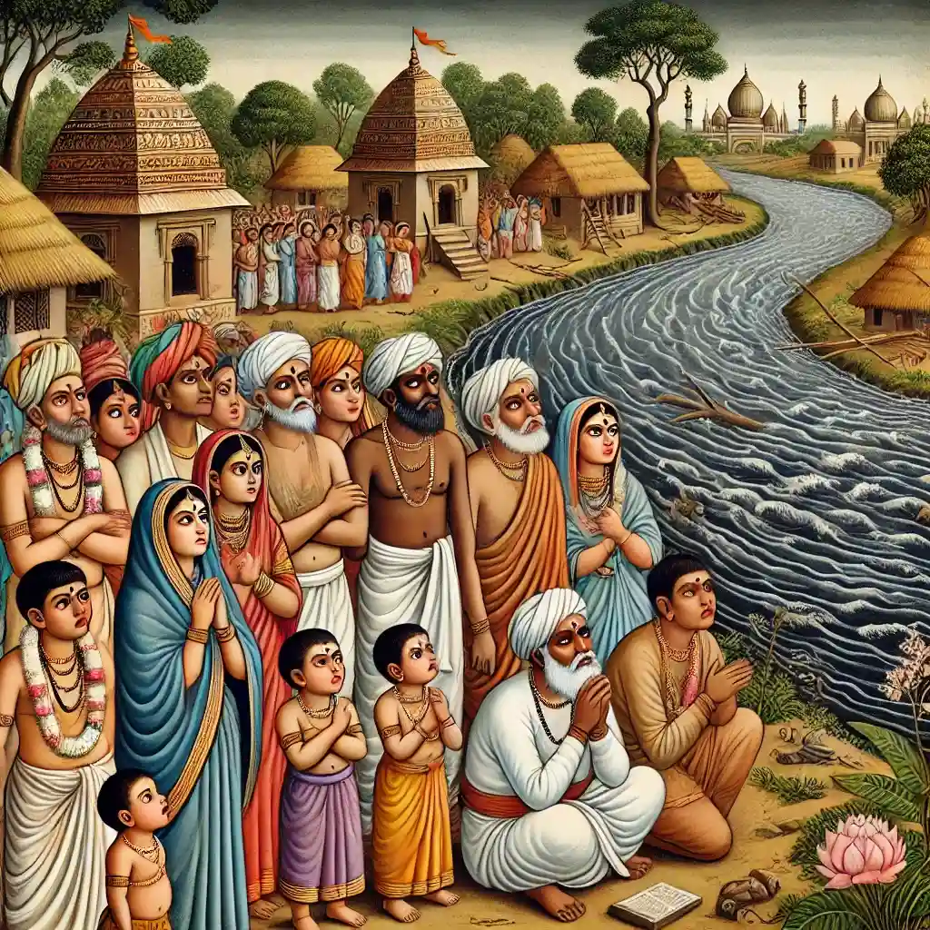 On the riverbank, chaos unfolded. Shree Krishna's friends' panicked. Word spread quickly to the village. Nanda Baba and Mother Yashoda arrived, frantic with worry. Mother Yashoda, in her desperation, attempted to jump into the river to save her beloved son, but Nanda Baba held her back. The entire village held its breath, waiting in fear.