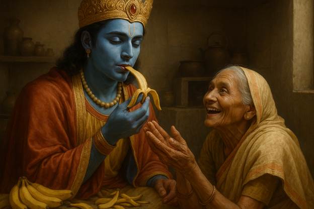 When Vidur returned, he was astonished to find Krishna being fed banana peels. In a mix of love and frustration, he offered halwa and puri, which he had bought from the market, and apologized.
