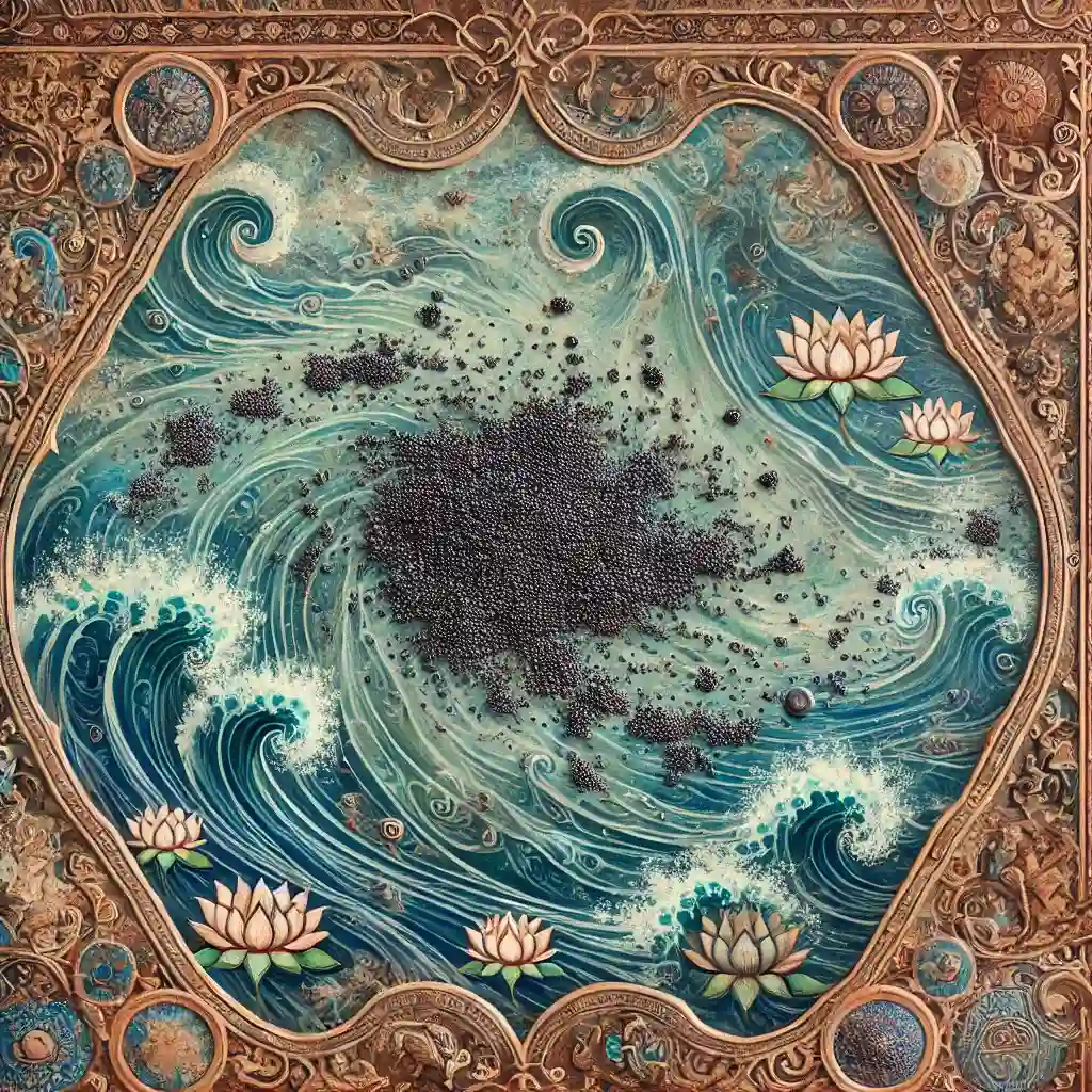 The Yadus followed King Ugrasen's instructions, grinding the iron rod into pieces and throwing it into the ocean. However, the ocean’s waves carried the iron filings back to land, where a powerful grass called Eraka grass began to grow, infused with those iron particles. Among the scattered filings, a small lump of iron remained, which was swallowed by a fish. This fish was later caught by a hunter named Jara. When Jara cut open the fish, he discovered the iron inside its stomach. He filed the iron and attached it to the tip of his arrow, unknowingly setting the stage for Shree Krishna's departure, as Shree Krishna had orchestrated these events as part of his divine plan.