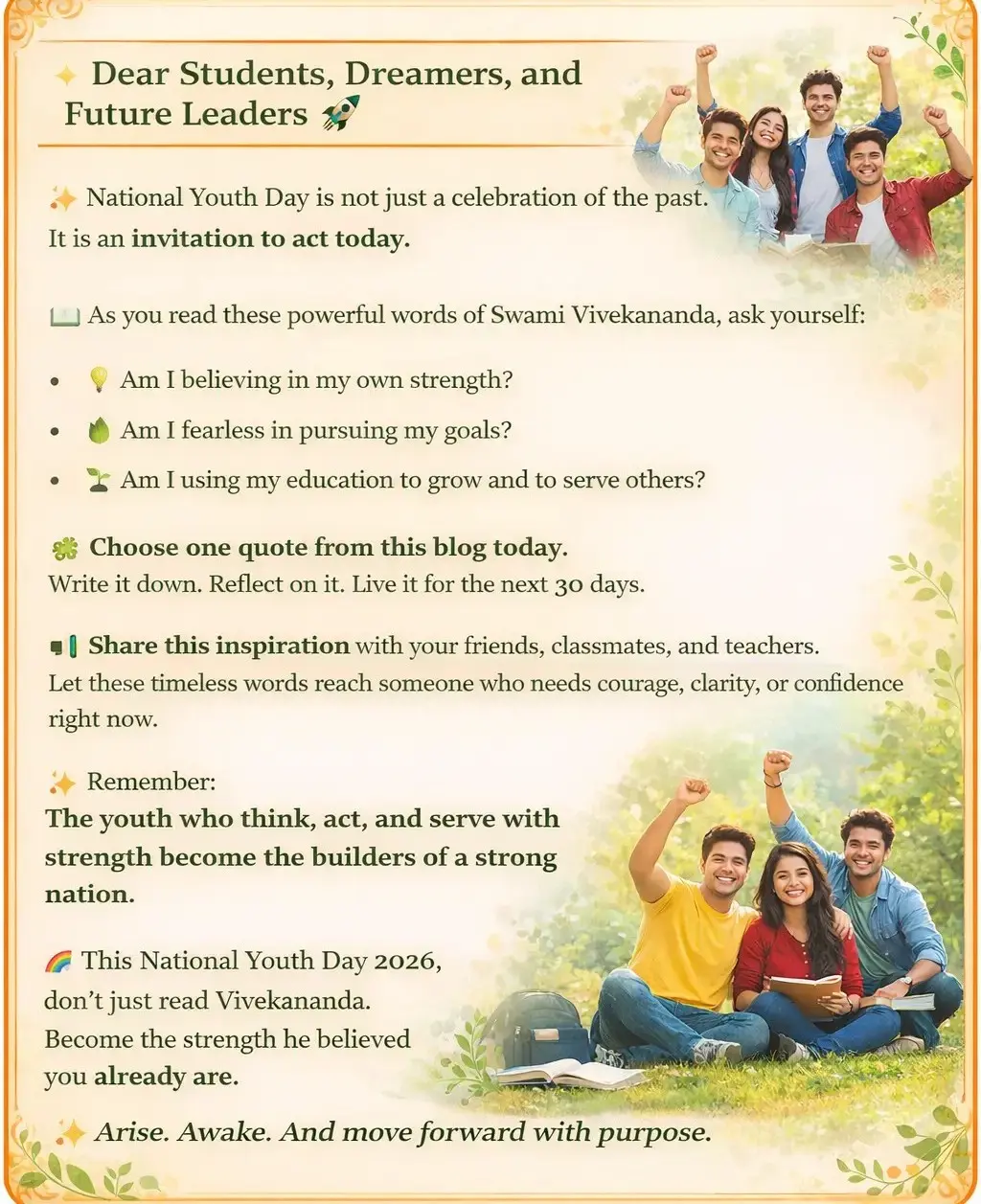 For students, National Youth Day is not merely a ceremonial event. It is a reminder that youth is not defined by age alone but by energy, ideals, and the courage to act on truth. Vivekananda repeatedly addressed students directly, urging them to be fearless thinkers, compassionate citizens, and tireless workers.