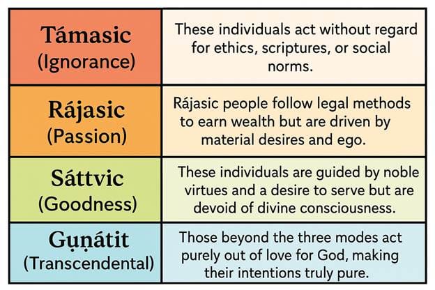 According to Vedic literature, people's intentions can be classified based on the modes of material nature: