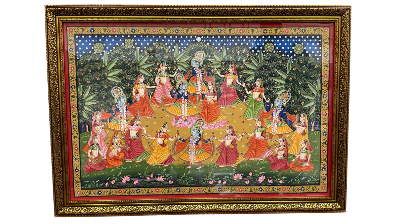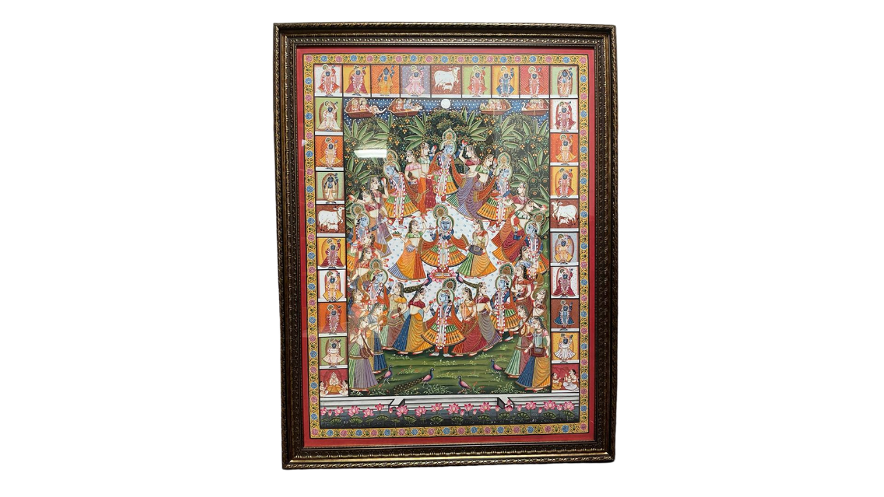 Preserving and conserving Nathdwara Pichwai paintings is of utmost importance to ensure their longevity.Radha Krishna Temple of Dallas is pleased to support and preserve this ancient art. All these paintings are directly supporting the artists' families and yet adding the devotional charm to the Home Decor in the houses in USA. We can take custom orders for any size and any leela of Shri Krishna.