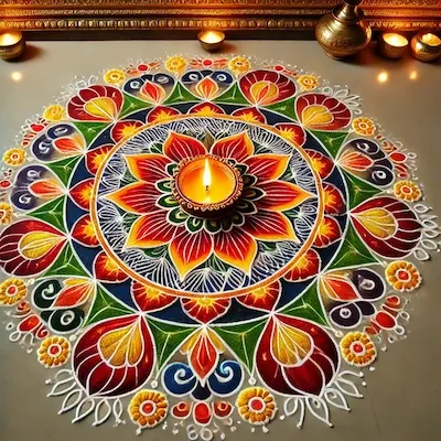 A diya at the center of your rangoli brings both tradition and meaning. Surrounded by floral or geometric designs, it symbolizes the victory of light over darkness and adds a spiritual essence to your festive floor art.