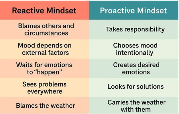 In contrast, the Proactive Mindset empowers one to think, “If I try hard enough, I can solve this problem.” This is a solution-oriented mindset, where one acknowledges the problem and starts hunting for possible solutions. In the face of problems, one takes responsibility for the way they feel and recognizes the need to manage their mind, rather than blaming external entities or people. A Proactive Mindset equips one to subordinate negative impulses, feelings, and moods to the higher purpose we choose for ourselves.
