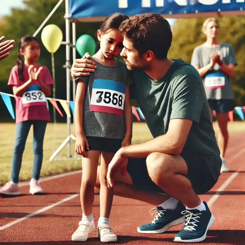 A little girl finishes 20th out of 50 in a race and begins to cry. Her father hugs and says: