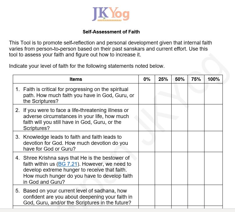This Tool is to promote self-reflection and personal development given that internal faith varies from person-to-person based on their past sanskars and current effort to engage in daily sadhana or devotional practice. Use the tool to assess your faith and figure out how to increase it. A downloadable tracking sheet available for you to use.