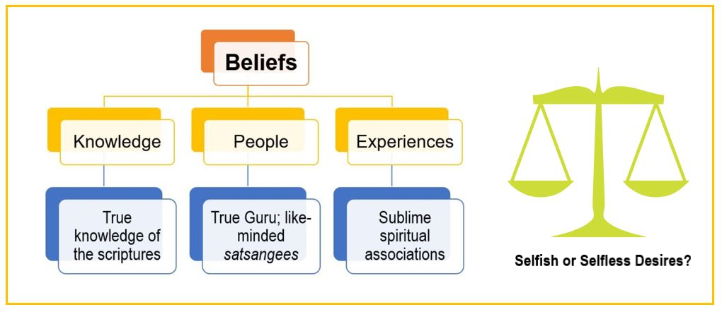 The belief-based choices we make will lead us toward inner growth and the desire to seek eternal happiness despite obstacles. If we believe that we are the divine soul, a fragment of God, then the purpose of our life will be to serve God, our eternal relative. Such strong, resolute, and knowledge-based beliefs will guide us to choose the desired course of action to accomplish highly valued goals.