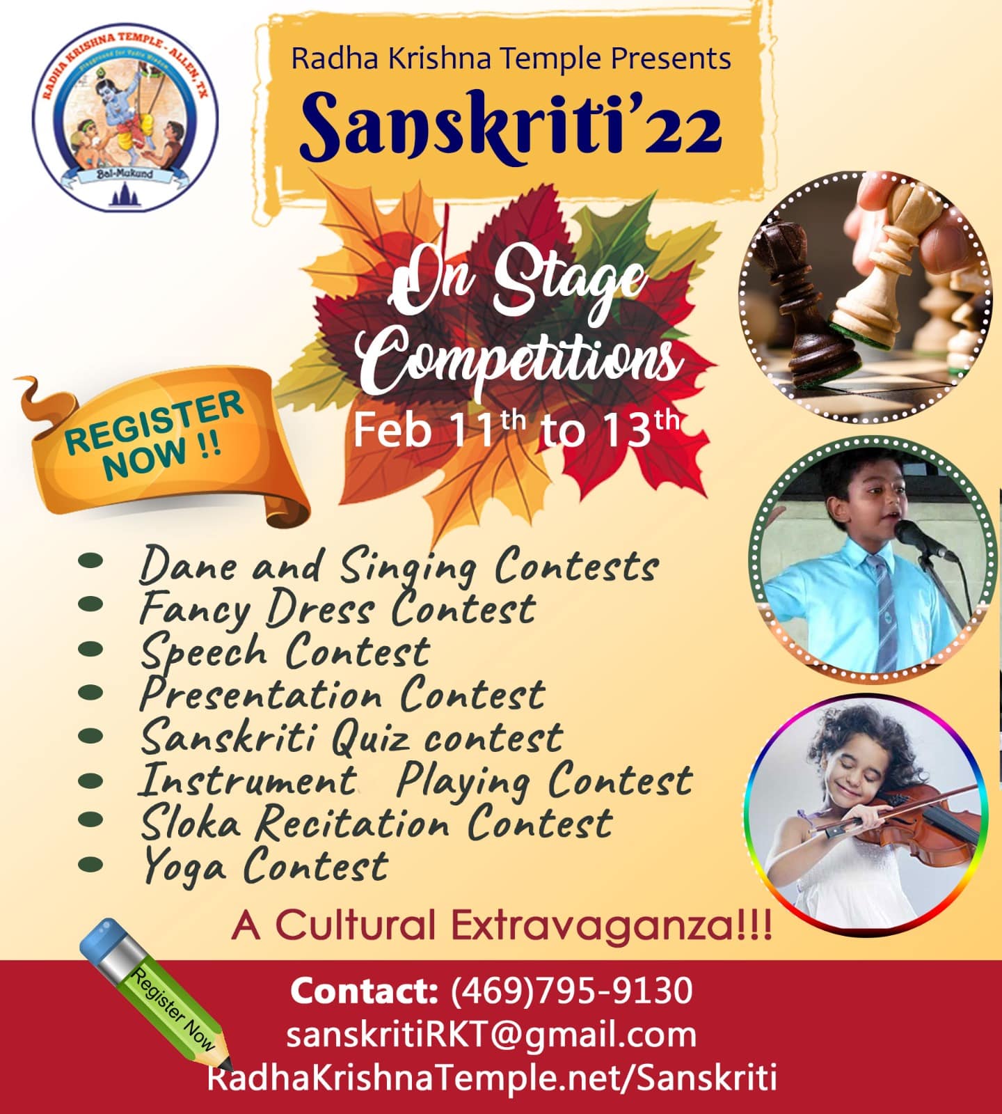 JKYog nurtures talent, creativity, and initiative of children and youth through a unique program like Sanskriti. It provides an opportunity to showcase talent in numerous categories to represent and celebrate our cultural heritage. Sanskriti is the forum where youngsters integrate creative expression and devotion through knowledge and skills in the performing, literary, and other arts! There will be many different contests in multiple areas.
