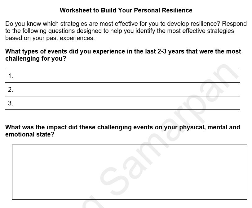 Do you know how we develop resilience over time to help us deal with challenges in life? A downloadable Worksheet to Build Your Personal Resilience is available for you to use. Respond to the questions to help you identify the most effective strategies so you can make a plan for how to handle a traumatic event when it occurs in future.