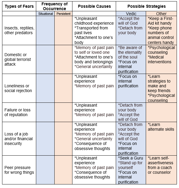 Some fears are situational and last until the threat of danger is averted. For example, a scary reptile turns the other way, a person is not fired from the job or is fired but finds a new job, or the severe weather threat is pulled back. However, other types of fears are more persistent and intense and have the potential to debilitate a person from leading a regular life (e.g., certain phobias, PTSD, specific disorders). Even those who follow the devotional path, are frequently afraid of spiritual downfall. For example, knowledge of the concept of karma and awareness that we must pay for the countless sins from endless lifetimes makes us fear the consequences in this life.