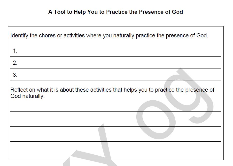 A downloadable tracking sheet is available for you to help you to practice the presence of God. You can keep a printed or e-copy to track your progress. Remember, change takes time!