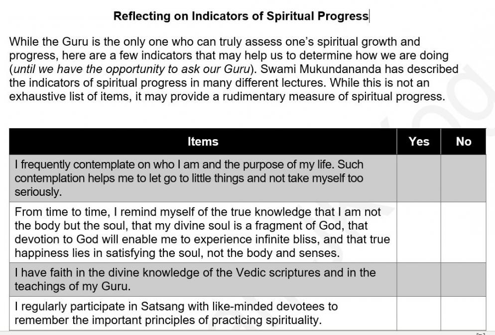 Use the tool Reflecting on Indicators of Spiritual Progress to assess your spiritual progress (until you have the opportunity to ask your Guru).