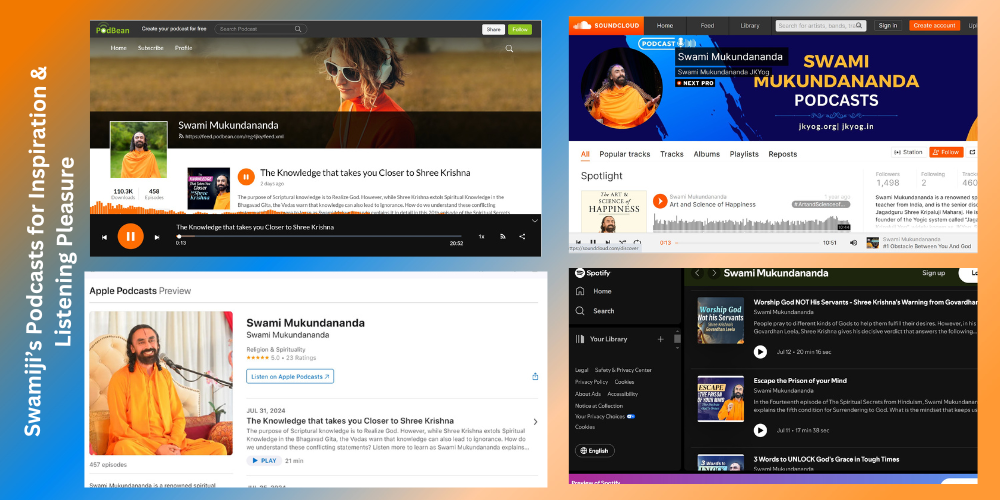 These sources offer a rich collection of audio lectures and kirtans by Swamiji and are easily accessible on the platforms noted below. The content of these audio sources spans a variety of topics, including Vedic wisdom and practical application tools. These platforms also feature popular interviews and lecture series (e.g., Power Of Thoughts).