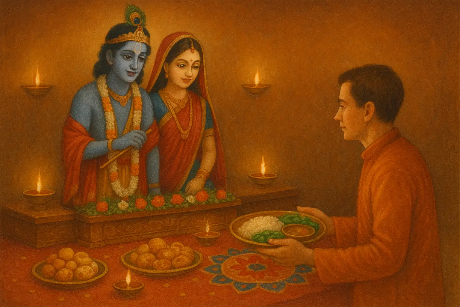 Bhakti, or devotional love, reshapes the scene of our relationship with food from basic consumption to a sacred exchange between devotee and the Divine. Our kitchens and dining tables become spaces where this transformation takes place, weaving a continuous thread of spiritual practice.