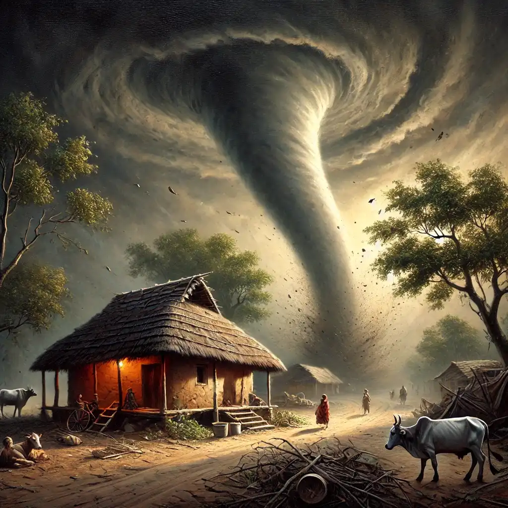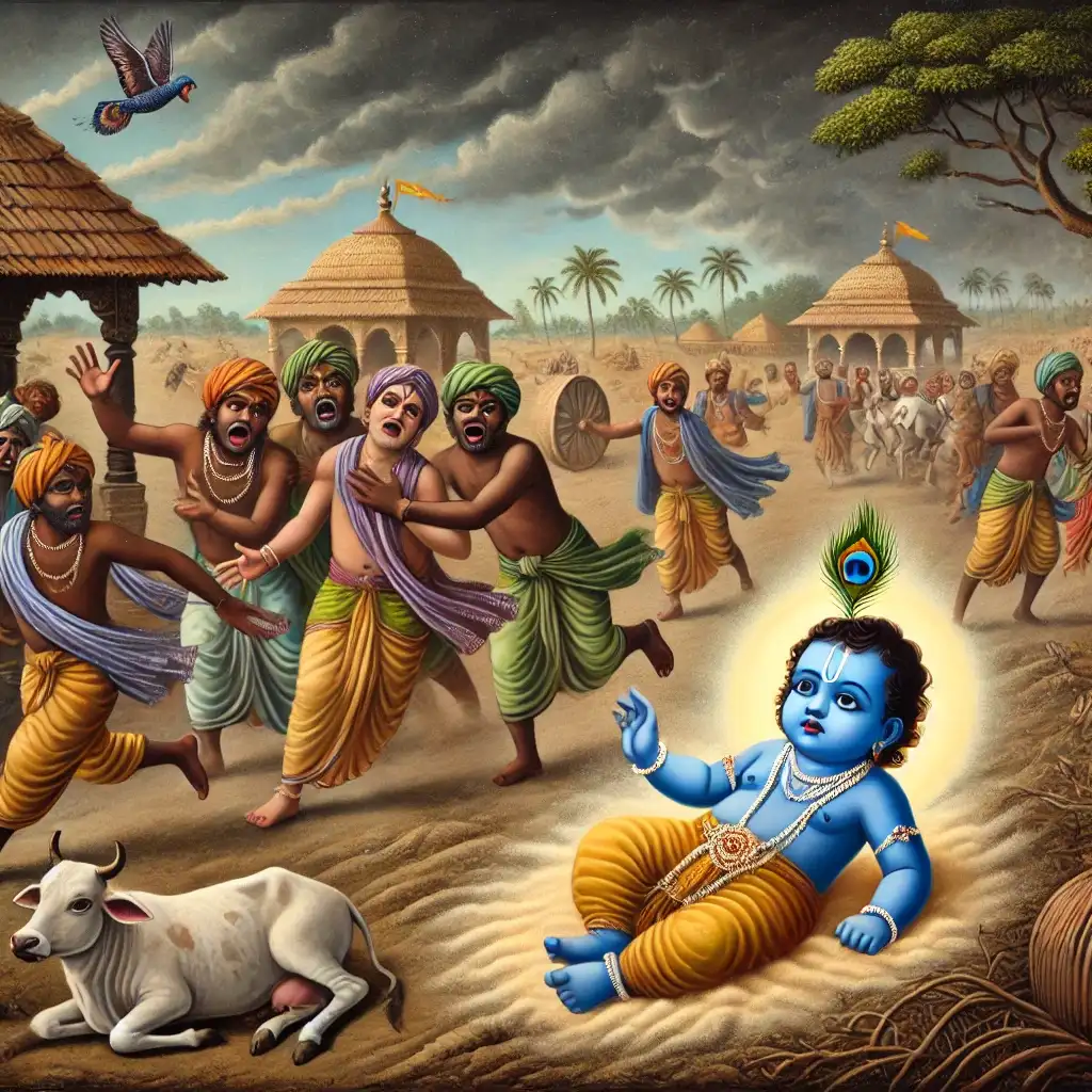 In the very next instant, the whirlwind struck. Trinavarth scooped up Shree Krishna and soared into the sky, intending to throw Him down and destroy Him. But this was no ordinary child. As the demon carried Shree Krishna higher, the child began to radiate unbearable heat. Trinavarth, who thought he held a defenseless infant, suddenly felt as though he was clutching fire wrapped in cloth.