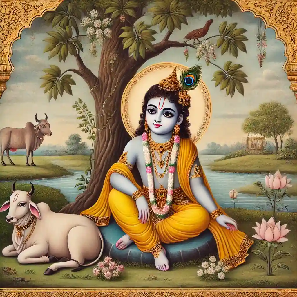 Gradually, the realization began to spread through the village. Their casual affection for Kanhaiya gave way to a deeper reverence, as they began to understand who he truly was. That recognition brought a change in how they behaved toward him. Reverence replaced the casual love they had enjoyed. The tender simplicity faded as people elevated him in their minds. Shree Krishna sensed this shift; he saw that the friendship, the closeness, the affection born of innocence was being replaced by distant reverence. He grieved this loss of intimacy.