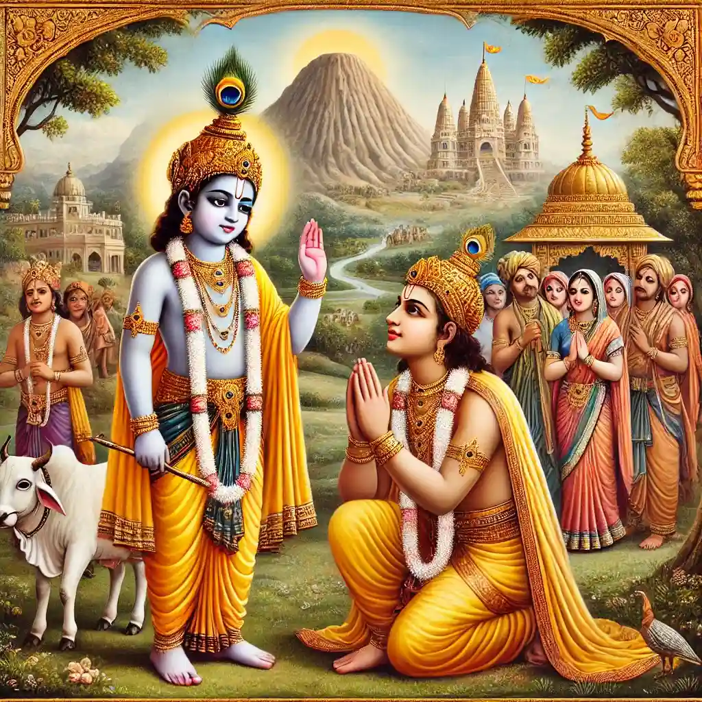 Sensing the emotional distance that had grown, Shree Krishna deployed Yogmaya, His divine power, to protect the fragile bond of love. In this way, He made the people forget the grandeur and again perceive the familiar companion they loved. The cycle restored the prior ease, the laughter, the shared love among friends.