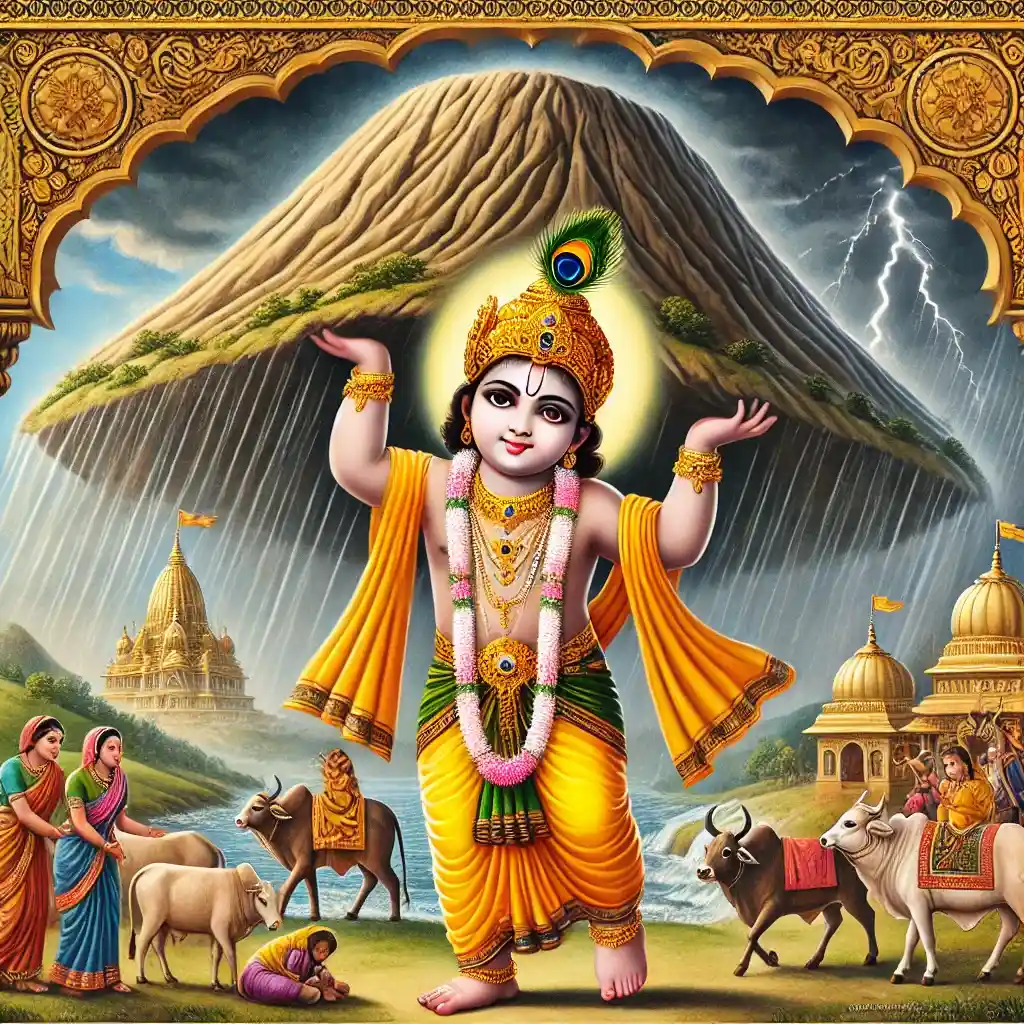 In response, Shree Krishna did something extraordinary. He lifted Govardhan Hill upon the weakest part of his left hand—his little finger—and held it aloft. For seven nights and seven days, the hill sheltered the villagers, cows, and all under its shelter. The Brajwasis weathered the tempest under its protective shade, their faith alive though their home was under siege.
