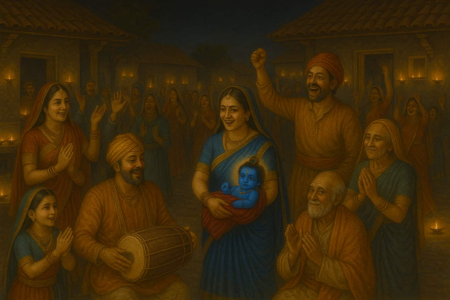 In time, the village buzzed with joy as it became known that Yashoda had conceived. The entire village rejoiced, seeing this as a blessing for their whole community. Yashoda, the queen of Braj, was carrying a divine spark, though few could grasp the scale of what was to come.