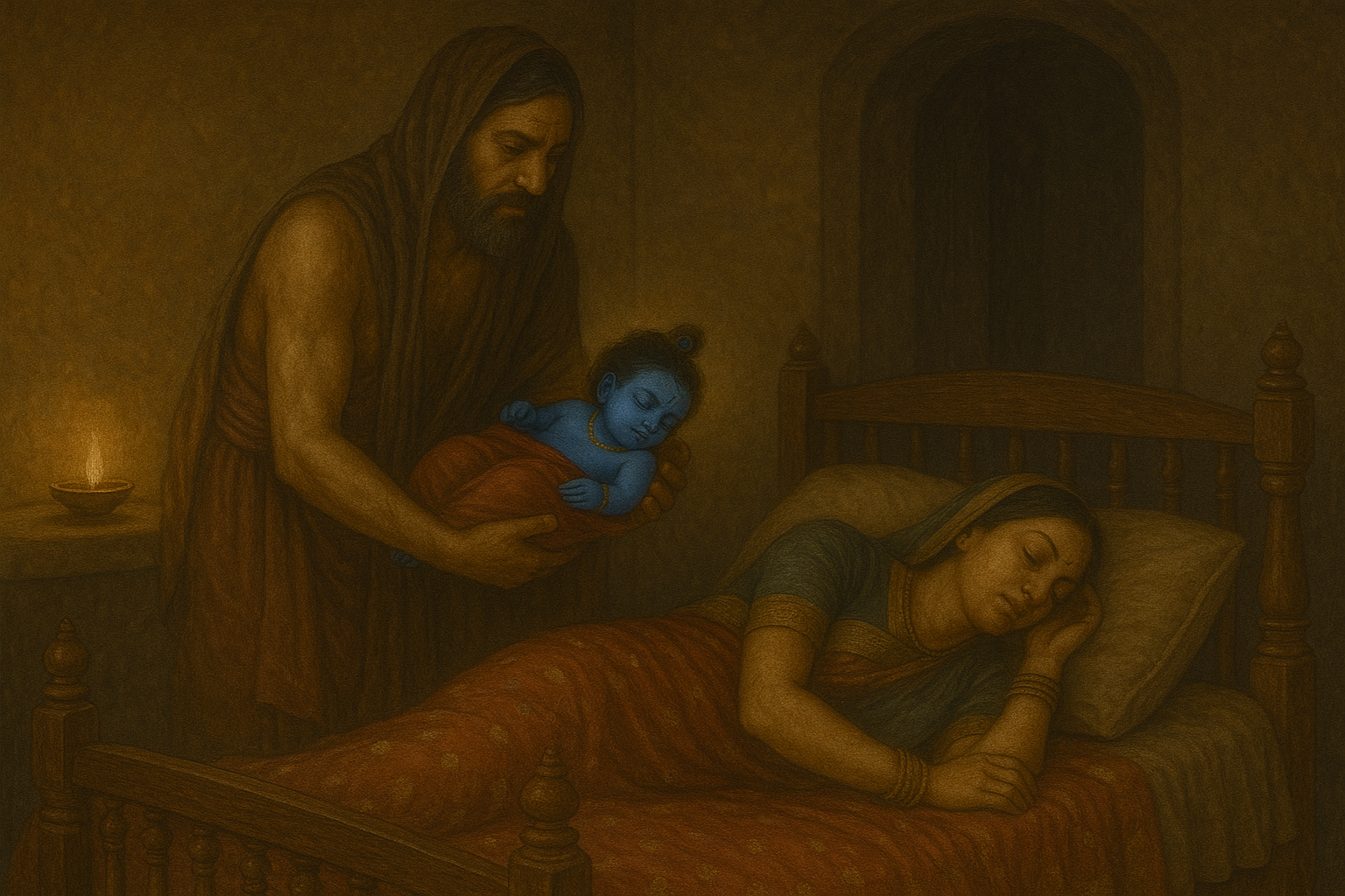 At the stroke of midnight, the divine curtain lifted. While Yashoda lay in solitude, Vasudev, the imprisoned father of Krishna in Mathura, carried his newborn son through the dark, rain-swept night. At that very moment, a baby girl was born to Yashoda, and the strain of childbirth caused her to faint. In her unconscious state, the divine exchange took place. Vasudev arrived, placed the bluish-complexioned boy next to her, and gently took the baby girl back to Mathura.